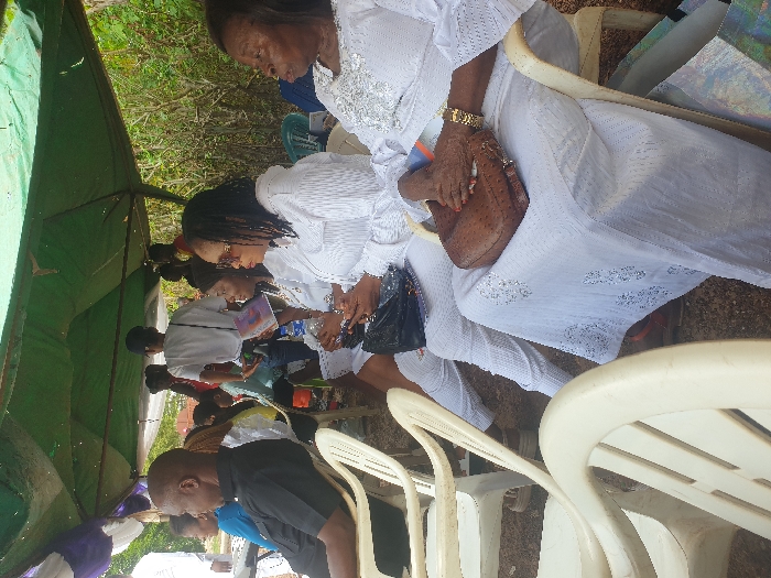 An outdoor gathering is depicted in Achara, Nigeria, under a green canopy tent