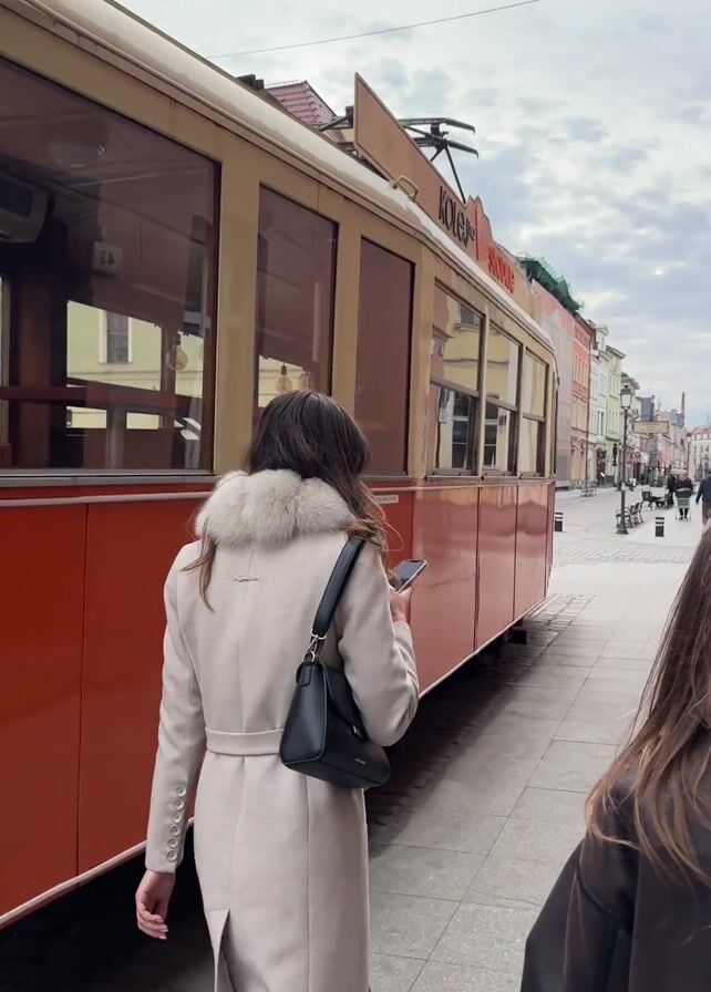 Two women walk down a pedestrian street. The woman closest to the camera wears a brown leather jacket, and the woman next to her wears a tan wool coat with a fur collar and carries a black purse. They walk parallel to an old-fashioned red and beige tram, which is parked on the edge of the sidewalk. Buildings with different colored facades line the street. The sky is overcast. Several pedestrians walk further down the street. Road signs are visible.