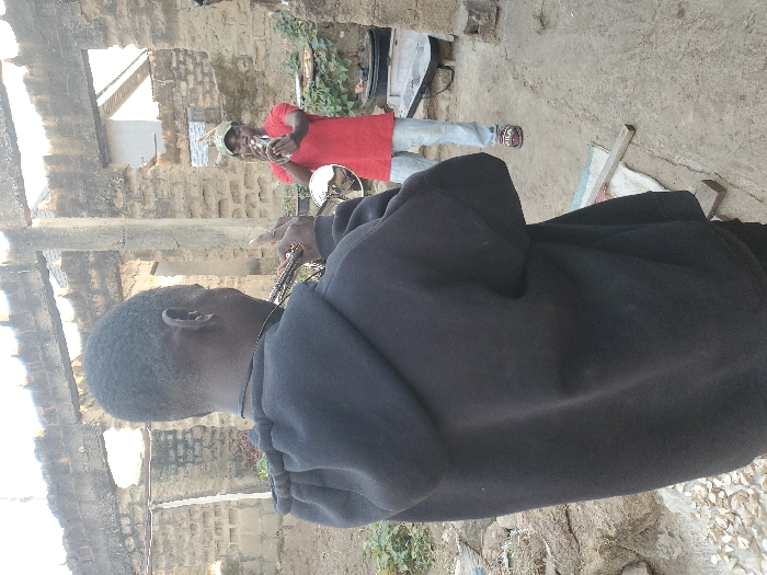 The image portrays two males engaged in a musical interaction outdoors in Gwong, Nigeria