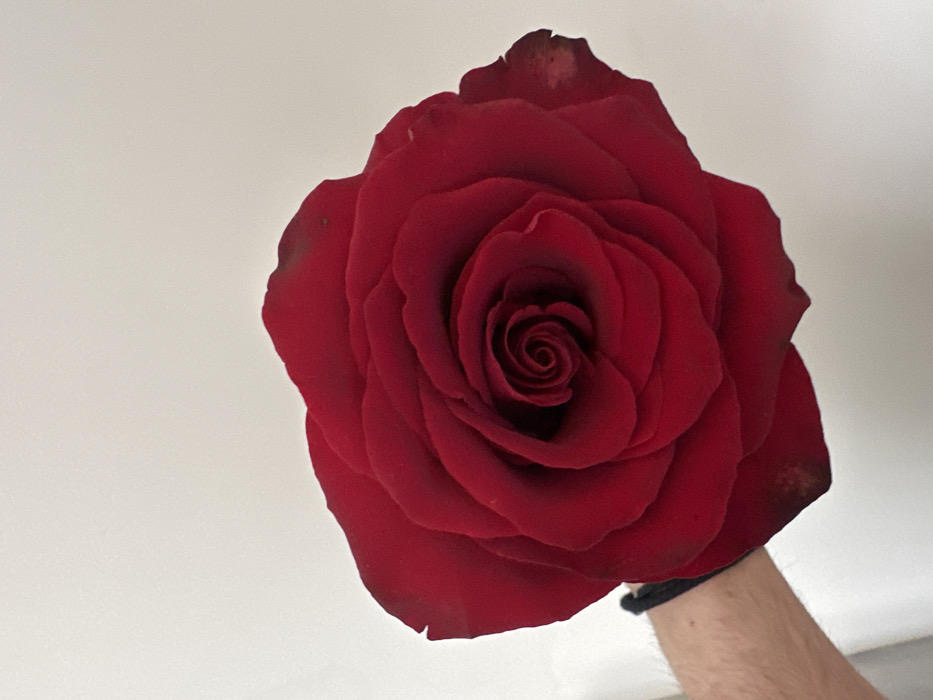 - "A single, large, dark red rose is centrally positioned, held from beneath by a human left forearm and hand, visible on the lower left" by FM-U0O2S2, licensed under CC BY 4.0