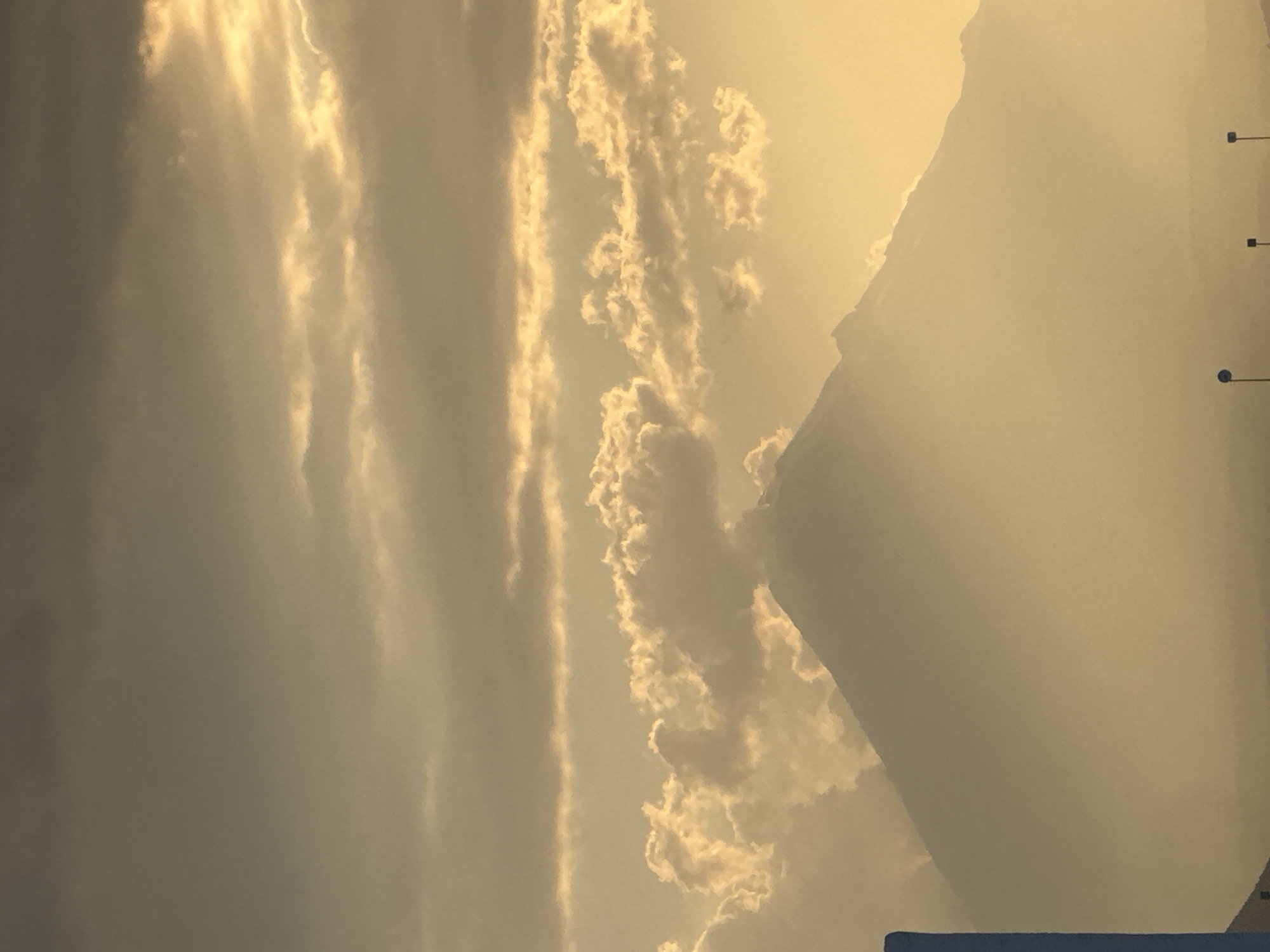 The image displays a landscape at what appears to be sunrise or sunset, centered on a large, conical mountain, likely Popocatépetl, as viewed from San Francisco Ocotlán, Mexico. The mountain's peak and upper slopes are partially obscured by scattered cumulus clouds and atmospheric haze, with the lower portions of the mountain fading into a dense, golden-hued mist. The sky above is filled with layered clouds, predominantly illuminated with a warm, golden-orange light from an unseen source to the right, creating bright highlights on cloud edges. In the immediate foreground, on the far left, a vertical dark blue structural element is partially visible. Three dark, slender poles, consistent with streetlights featuring disc-shaped tops, are silhouetted against the hazy mid-ground at the bottom of the frame. No individuals or specific actions are discernible.