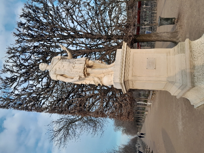 The scene depicts a full-body, light-colored stone statue of Gaius Julius Caesar, situated in the Jardin des Tuileries, Paris, France
