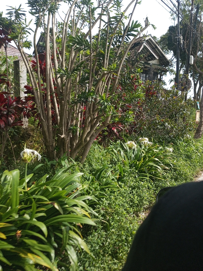 The image captures an outdoor scene in Kandenuwara, Sri Lanka, dominated by dense vegetation under bright daylight. In the bottom right corner, a partial view of a human's upper leg or hip, covered in dark fabric, is visible. The foreground and midground feature numerous plants: a prominent clump of multi-stemmed plants with pale trunks and green foliage, multiple broad-leaved plants with white, spidery flowers (likely Crinum Lilies), and a variety of smaller green bushes and groundcover. Dark red-leaved plants are visible behind the central tall foliage. In the upper midground, partially obscured by trees, stands a building with a light-colored facade and a dark-tiled, gabled roof. A dark opening or window is visible on its front. To the far left, a light-colored concrete pillar or wall is partially visible. The upper right background shows a utility pole with several dark overhead wires and a white rectangular component attached. A small, light-colored rectangular object is also affixed to a tree trunk near the pole. No discernible human actions or interactions are depicted beyond the implied presence of the person in the foreground.