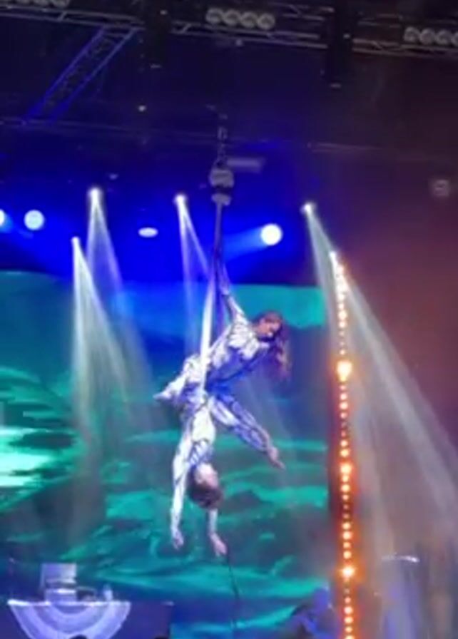 A video shows two aerial acrobats performing on silks suspended from the ceiling, in front of a large audience. The performers are wearing matching white and blue patterned costumes. The stage is lit with blue and white spotlights, and a large screen in the background shows an abstract image. The audience is visible in the foreground, and they are clapping and cheering.