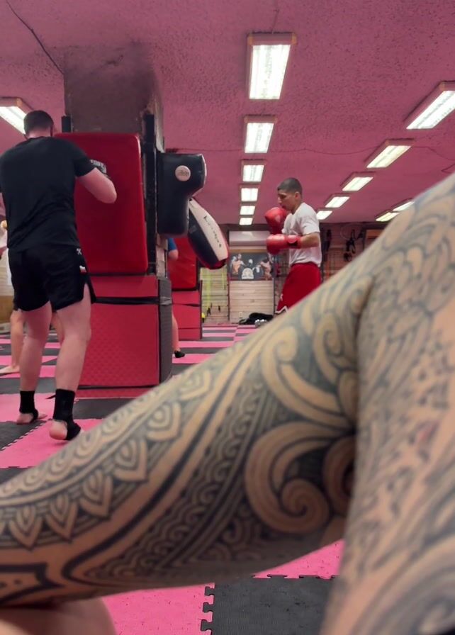 In a brightly lit boxing gym with a pink ceiling, a tattooed arm is positioned in the foreground, partially obscuring the view