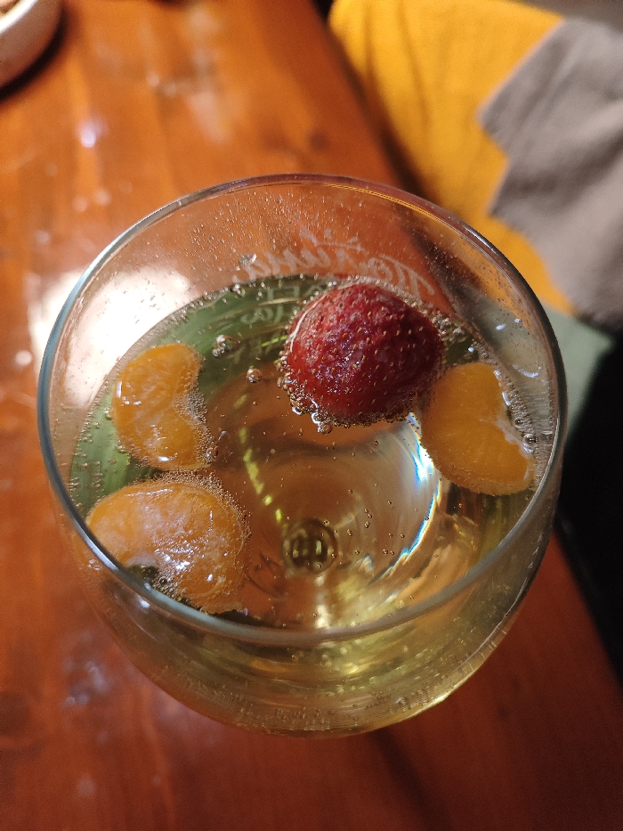 A top-down view shows a clear glass filled with a bubbly, light yellow liquid. A red strawberry and several orange segments float within the drink. Bubbles cling to the fruit and the glass's interior. The glass sits on a wooden surface. A glimpse of a yellow object and a grey cloth are visible in the background, slightly out of focus.