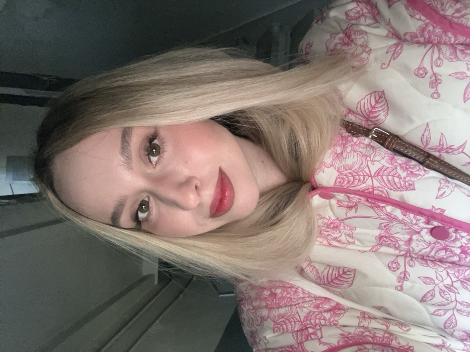 A blonde female is depicted in a close-up, chest-up portrait within an indoor, dimly lit environment. Her shoulder-length hair is light blonde and parted on the viewer's left. She has brown eyes, defined eyelashes, and is wearing red lipstick and subtle cheek blush. She exhibits a slight smile and looks directly forward. She is attired in a quilted jacket featuring a white background with a vibrant pink floral pattern consisting of roses and foliage, accented by pink trim and buttons. A dark brown leather strap, consistent with a shoulder bag or purse, crosses diagonally over her right shoulder. The background is indistinct; on the viewer's left, faint rectangular shapes suggest a stairwell or internal architectural elements. The specific location within the city of Minsk, Belarus, is not discernible from the visual information presented.