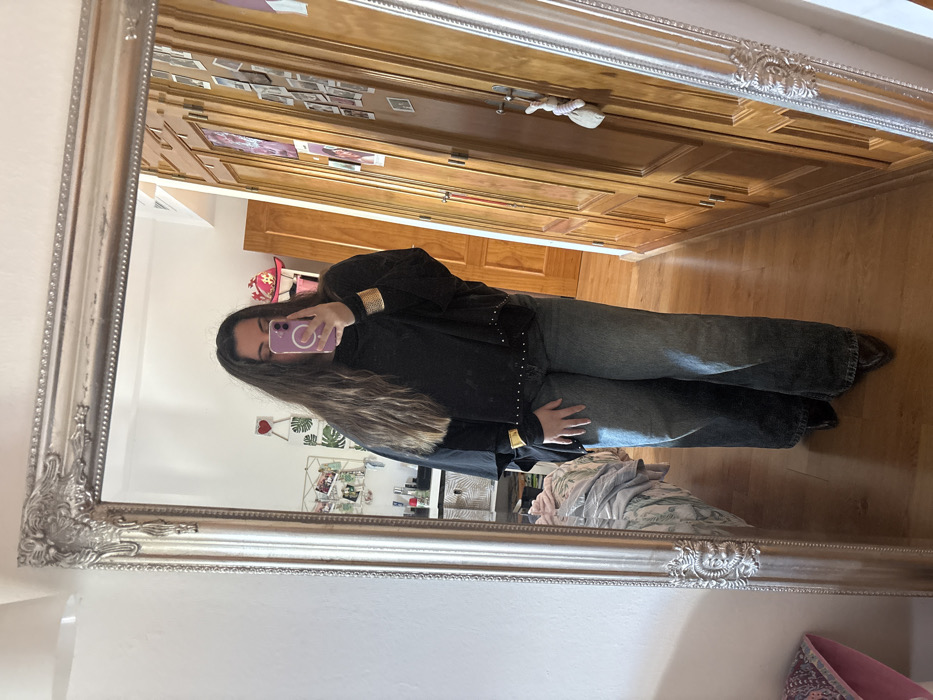 The scene is located within a domestic interior in Urbanización Encinares De Alcolea, Spain. An individual is depicted in a full-body mirror selfie, standing on a light wood laminate floor. The subject is a female with long, wavy brown hair, wearing a black, asymmetric top with silver stud embellishments along the hem, light blue wide-leg jeans, and black pointed-toe shoes. She holds a light purple smartphone with a circular grip in front of her face, obscuring it. A wide, gold-colored mesh cuff bracelet is visible on her right wrist, and a similar item is partially visible on her left wrist. The mirror's ornate silver frame is prominent. Reflected in the mirror to the left is a white wall, a bed covered with a light-colored duvet featuring a floral or paisley pattern, and a shelf above the bed displaying various items including small plants, framed photos, and a white, possibly heart-shaped, decorative object. A white lampshade is visible at the top left of the reflection. Reflected to the right is a large wooden wardrobe with two doors, horizontal paneling, and metal handles. Numerous small photos or postcards are taped to the wardrobe doors. A white, knitted animal toy hangs from one of the wardrobe handles. Beyond the wardrobe, a wooden door indicates a hallway or adjacent room.