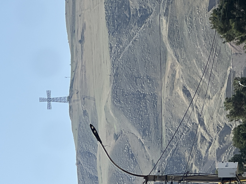The image captures a static, outdoor scene in Rustavi, Georgia, under clear daylight. In the immediate foreground, positioned on the left, is the upper portion of a dark gray, curved streetlamp arm terminating in a twin-bulb LED fixture. Partially visible below and to the left of the streetlamp arm is a weathered utility pole with multiple black electrical wires extending horizontally and diagonally, along with an attached white rectangular utility box. The tops of dark green coniferous trees are visible along the bottom edge of the frame. The midground and background consist of arid, rolling hills characterized by sparse, light brown-green vegetation, exhibiting visible dirt tracks and erosion patterns. Dominating the distant hilltop at the center-top of the image is a large, prominent latticework metal cross, identified as the Rustavi Cross. A narrow, unpaved path ascends the hillside directly towards the base of this cross. To the right of the cross, a slender communication mast or tower is also present on the hilltop. The sky above is clear and light blue, indicating bright conditions. No individuals are depicted in the scene.