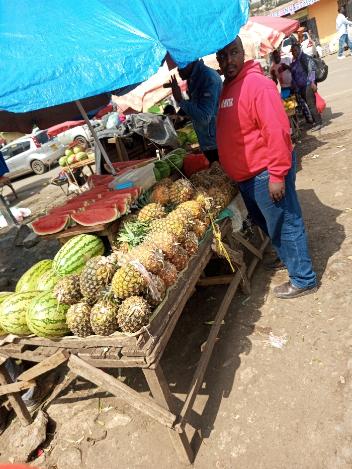 The image captures an active outdoor fruit market stall in Kiserian, Kenya, under a bright blue tarp providing shade