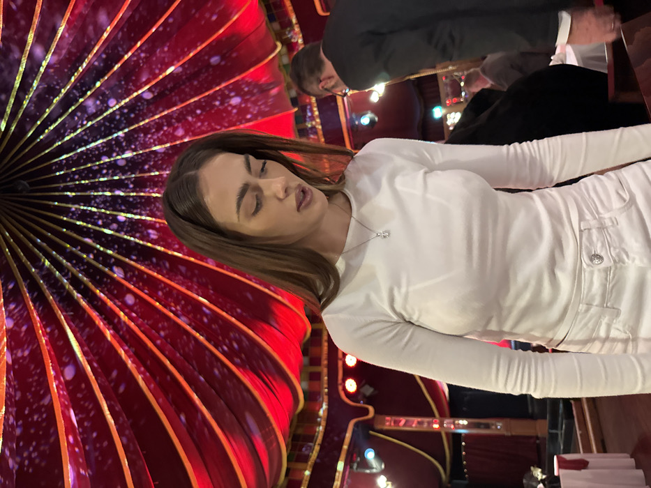 The scene is set inside a lavish entertainment venue in Vienna, Austria, characterized by a striking, domed, tent-like ceiling. This ceiling is draped with deep red fabric, possibly velvet, arranged in radial segments with gold-colored ribbing and numerous small, reflective, or translucent specks scattered across its surface, giving it a starry appearance. The lighting within the venue casts a warm, predominantly red and amber glow, augmented by stage-style spotlights in the background, some emitting blue or white light. In the mid-ground to the left, a raised stage area with red drapes is visible, and several tables covered with white tablecloths and red accents are present, suggesting a dinner show or cabaret setting, reminiscent of the Palazzo Varieté or a similar high-end event space. The primary subject is a female, approximately 20-30 years old, positioned centrally and facing slightly towards her right, looking downwards with her lips slightly parted. She has long, straight brown hair, parted down the middle. She is dressed in a form-fitting, long-sleeved white top and white jeans, complemented by a silver-colored necklace with a single, clear stone pendant. To her right, in the background, a male individual is partially visible, wearing a dark suit jacket and glasses, leaning forward. Further in the background, several blurred figures are seated at tables. No direct interaction between the main subjects is discernable.