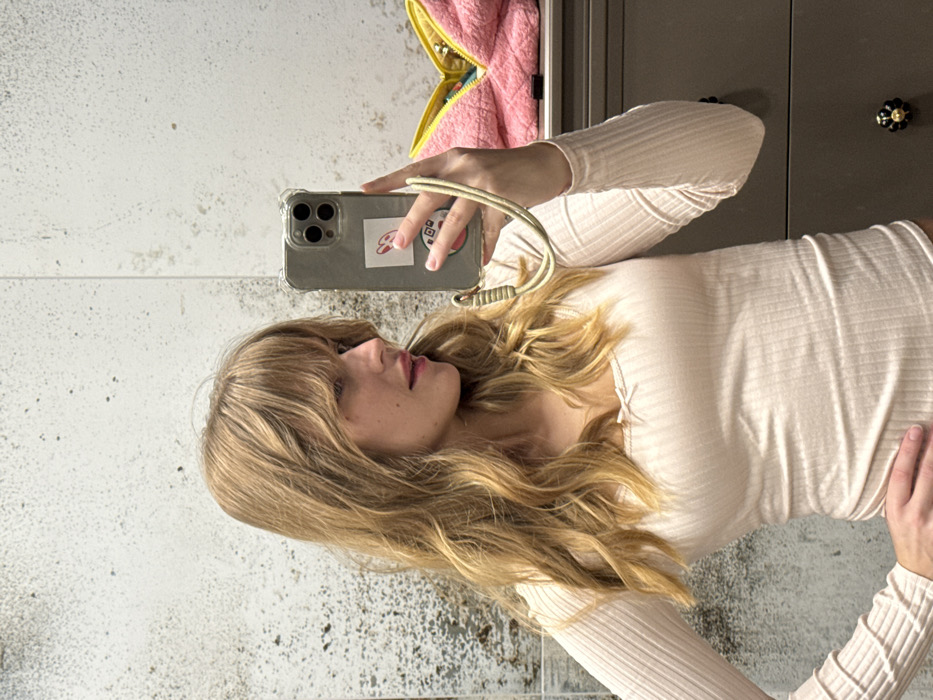 - "A young Caucasian female with long, wavy blonde hair and bangs is depicted taking a mirror selfie indoors in Hrodna, Belarus" by FM-yjK1X2, licensed under CC BY 4.0