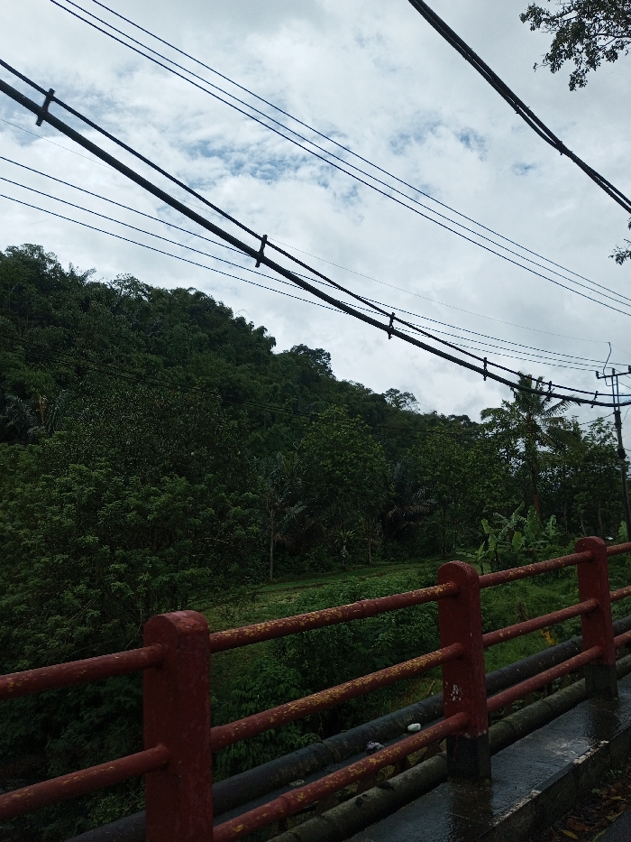 The scene depicts a natural landscape in Serpang Shalli, Bhutan, under an overcast sky featuring scattered white clouds. Multiple black utility lines, including thicker insulated cables, span the upper portion of the image, with a section of a utility pole visible on the far right. A densely forested hill or mountain, covered in various shades of green foliage, dominates the background and central mid-ground, extending down to a lower, flatter area of vegetation. In the foreground, a red-painted metal railing, exhibiting significant rust and peeling paint on its horizontal bars and vertical posts, occupies the lower right and center. The concrete surface beneath the railing appears wet. Below the concrete, several dark-colored pipes are horizontally arranged, with minor debris visible near them. No individuals, animals, or active interactions are present.