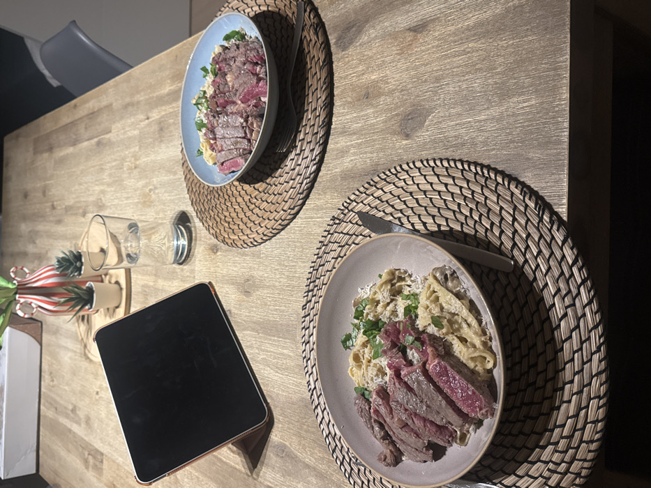 A dinner setting for two is depicted on a light-colored wooden dining table in Eindhoven, Netherlands. Two bowls of food are centrally positioned on circular, woven placemats. The bowl on the left contains pasta with a creamy sauce, possibly with mushrooms, topped with grated cheese and green herbs, alongside several slices of medium-rare steak. A silver-colored dining knife rests on the placemat to the right of this bowl. The bowl on the right contains an identical meal, with a silver-colored dining fork resting on its placemat. A clear glass filled with water is situated behind the left bowl. To the far left, a tablet computer with a dark screen is propped up on a brown stand. In the background, a small, round wooden tray holds a red and white striped vase flanked by two miniature potted succulents. No individuals are visible in the scene. The overall lighting is consistent with an indoor environment.