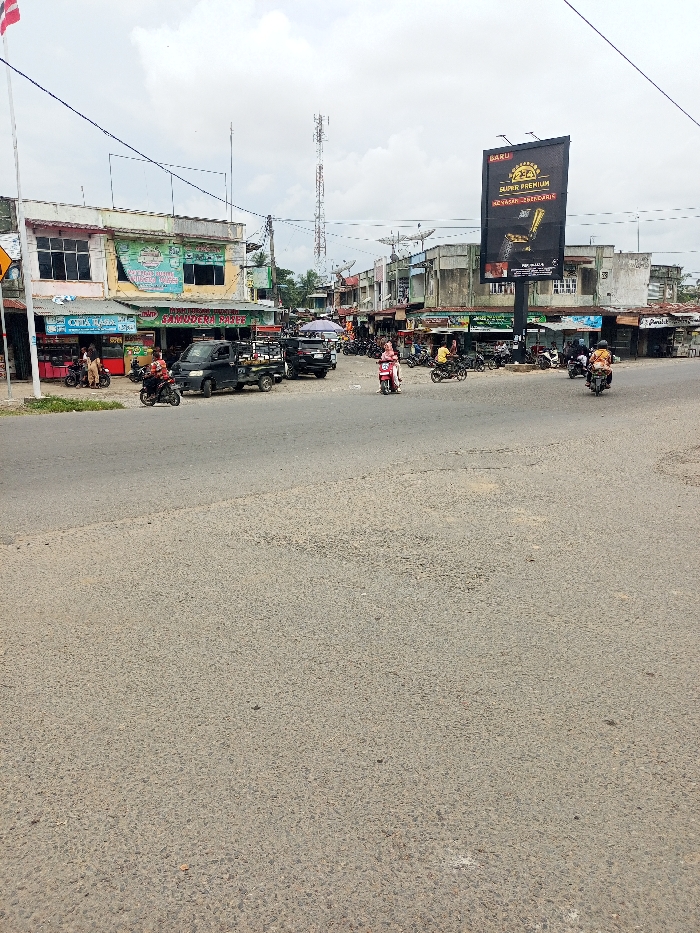 This image depicts a street scene in Blang Nibong, Indonesia, from a slightly elevated perspective overlooking a paved road