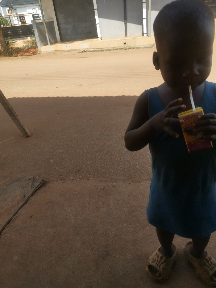 This image captures a young child standing outdoors in Owa-Alero, Nigeria. The child, with dark skin and closely cropped hair, is wearing a blue sleeveless top and light brown open-toed sandals. They are actively consuming a beverage from a yellow "Chivita" brand juice box using a white straw, holding the box with both hands. The child's head is tilted downwards, focusing on the straw. The immediate ground surface beneath the child is reddish-brown, unpaved earth, with a visible shadow line across the mid-ground. To the left foreground, a section of a weathered wooden plank lies on the ground, and a light-colored wooden post is partially visible vertically. In the background, beyond a transition to what appears to be a lighter, possibly paved road surface, residential structures are present. On the right, a light grey concrete building facade with vertical darker grey divisions is visible. On the left, a white building with a dark roof is seen behind a decorative black metal gate.