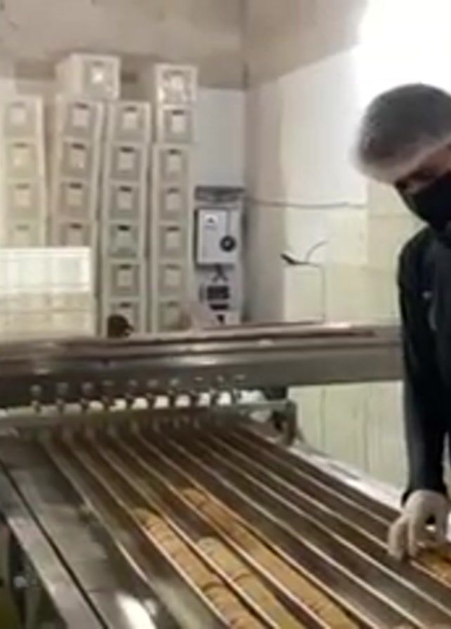 Two men in hairnets, masks, and gloves are working on a food production line in what appears to be a factory setting. The man on the left is wearing a long white robe and is placing long, tubular pastries into white crates. The man on the right is wearing a black shirt and is similarly placing pastries into crates. In the background, there is another person, also wearing a mask, working on another production line. Stacks of white crates can be seen behind the workers. The factory has concrete walls and floors.