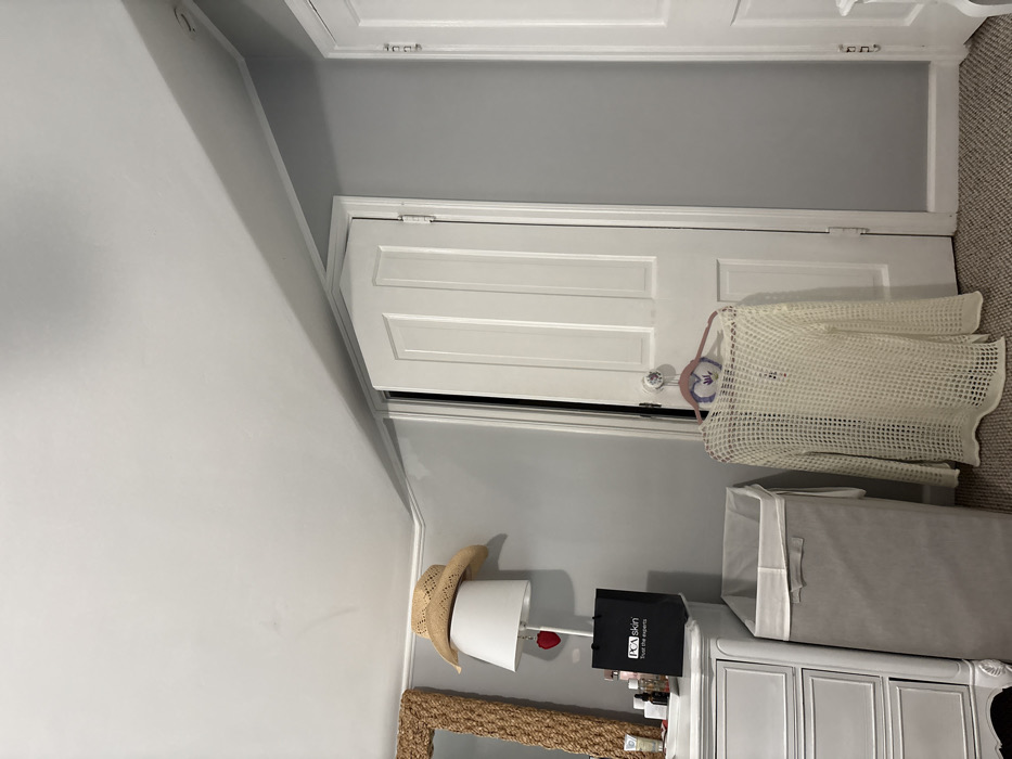 An interior image depicts a residential room, identified as being in Newport Beach, United States. The room features light gray walls and a white ceiling that exhibits a slight upward slope on the right side, where it meets the wall, outlined by white crown molding. The floor is covered with a textured light brown carpet. On the left, a white multi-drawer dresser or vanity is partially visible. Resting on its surface are various cosmetic bottles and containers, alongside a black "PCA skin trust the experts" shopping bag. A white table lamp stands on the dresser, its shade topped by an inverted straw sun hat. A small red heart-shaped ornament hangs from the lamp's arm. Adjacent to the dresser, a tall, rectangular light gray fabric laundry hamper with a white rim and handles is positioned. Towards the right, a white panel door is slightly ajar. A light-colored, open-knit long-sleeved top hangs on a pink hanger from the decorative white doorknob of this door. A small purple heart-shaped sachet or ornament is attached to the top of the hanger. To the far right, a second white panel door is mostly closed, with only its edge and hinges visible. No individuals are present in the scene.