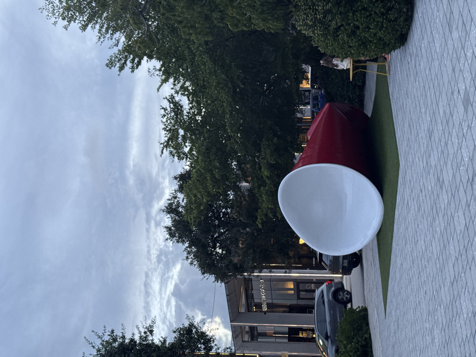 The image displays an outdoor urban environment, specifically identified as Brickell City Centre in Miami, United States, based on visible architectural elements and signage on a background building. The central subject is a large, oversized sculpture of a red solo cup, positioned horizontally on its side with its white interior facing upward and to the left. The sculpture rests on a square patch of artificial green turf. The immediate foreground features grey interlocking pavers. Beyond the sculpture, a modern multi-story building with prominent vertical white pillars and expansive glass facades is visible, with interior lighting. Two vehicles are present on a roadway in front of this building: a grey SUV is observed in motion, traveling left, and a dark SUV is parked. Lush green trees and dense shrubs border the scene on both sides and in the background. On the far right, partially obscured by green shrubbery, a single individual wearing light-colored clothing stands next to a small, yellow circular table. The sky is uniformly overcast with a grey cloud cover.