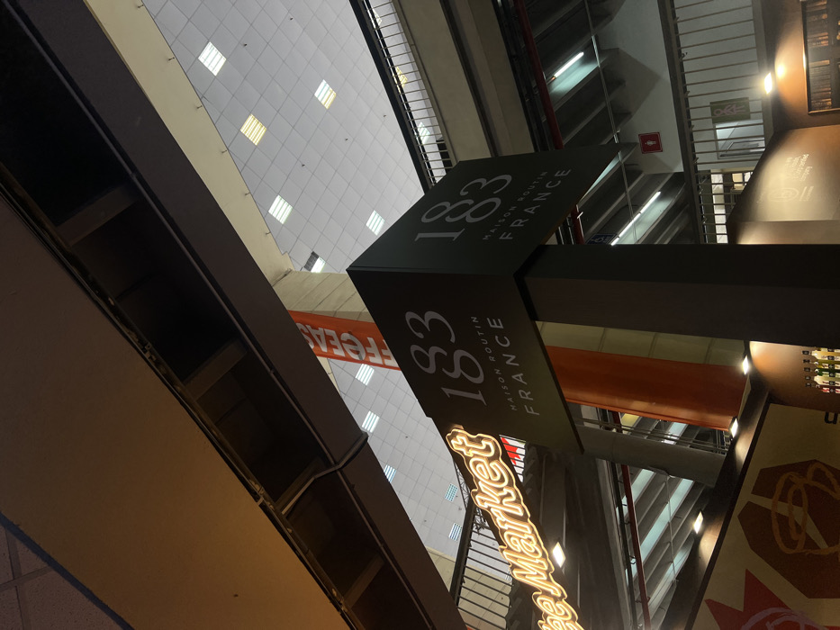 An upward-angled view captures an interior scene within a multi-level commercial establishment, identified as located in Bucharest, Romania. The primary subject is a dark grey vertical pillar bearing white text signage on two visible faces, reading "1883 MAISON ROUTIN FRANCE." To the left of the pillar, a yellow neon sign spells "Coffee Market." Below this sign, a wall features a brown and red graphic depicting a stylized coffee cup with radiating lines. Further down, a counter displays multiple bottles, likely beverage syrups. Overhanging this area is a dark structural beam. To the right and background, the building's multi-level architecture is apparent, featuring walkways with dark railings and a light-colored ceiling with numerous square, recessed lights. A long, orange banner hangs vertically in the mid-background, partially obscured, showing "FFEEAS" in white text. Red fire suppression piping is visible on an upper level. On a wall in the background, near a railing, a red male restroom icon and a green female restroom icon are affixed. No individuals are present in the frame. The scene is illuminated by a combination of artificial overhead lighting, neon signage, and spotlights directed at displays.