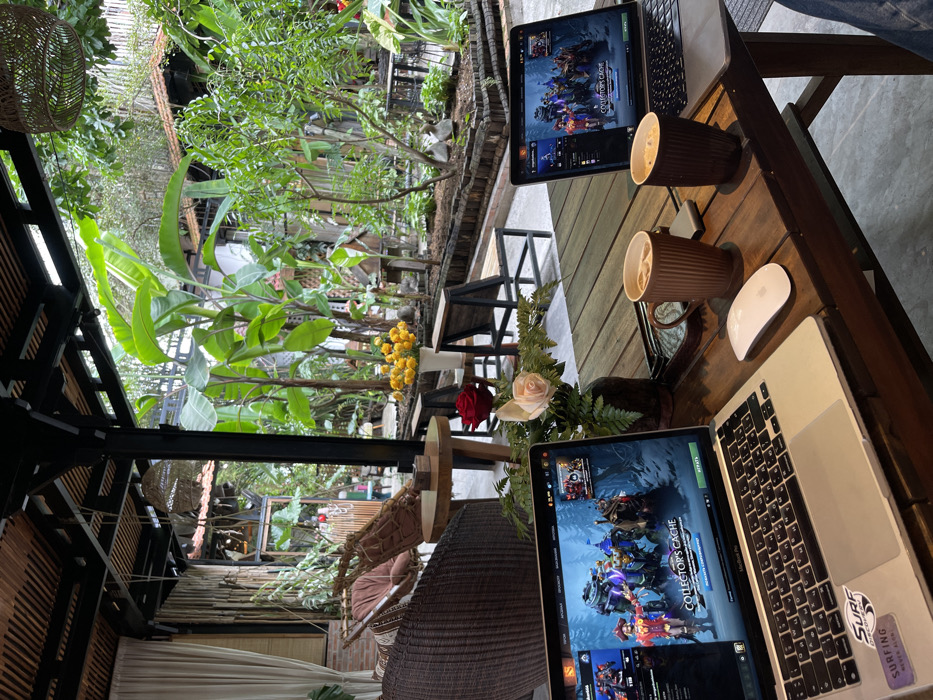 Two laptops sit on a wooden table amid lush greenery. Both screens display a game interface. Two mugs, presumably filled with coffee, sit between the laptops. A white mouse rests near one of the laptops, and a small vase of roses adds a touch of elegance. The setting is outdoors, possibly a cafe or garden with a relaxed atmosphere.