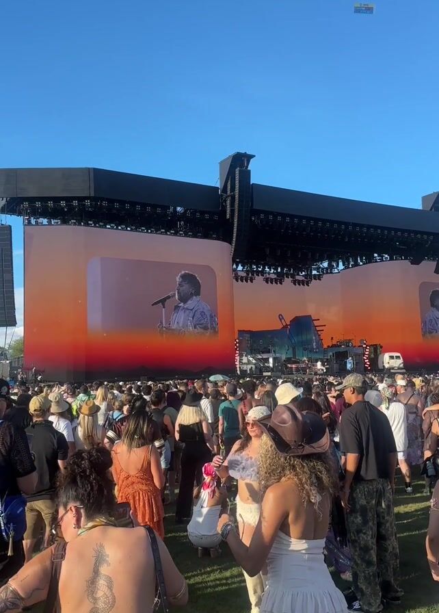A large crowd of people faces a huge stage at an outdoor music festival under a bright blue sky. The stage features two large screens displaying the image of a singer. The crowd consists of a diverse mix of people wearing various casual and festival-style outfits, including hats, dresses, and patterned shirts. Many are dancing and moving to the music. Some people have tattoos visible. The overall atmosphere is lively and festive. A banner is visible in the sky.