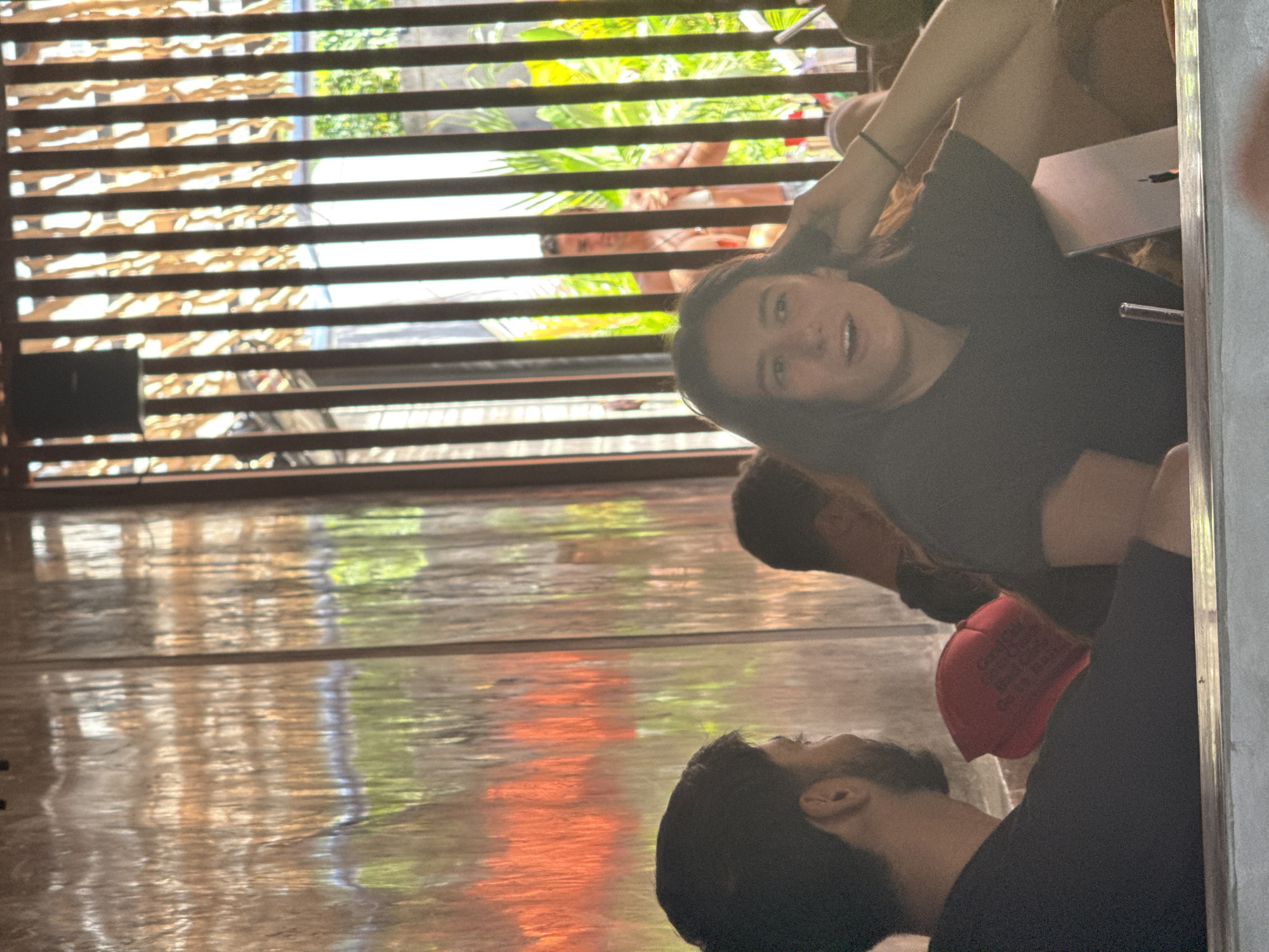 group of people seated at a table. A woman in a black shirt is facing the camera, smiling. Another person is partially visible to her right. To the left is a man with a beard and black shirt facing away from the camera, with a red hat partially visible above him. The scene is framed by a wooden structure, possibly a pergola or shade structure, providing a partially obscured view of vegetation and other structures in the background. The reflections on the table suggest a well-lit environment, possibly outdoors or in a semi-open space. The image was taken in Kuta Selatan, Indonesia.