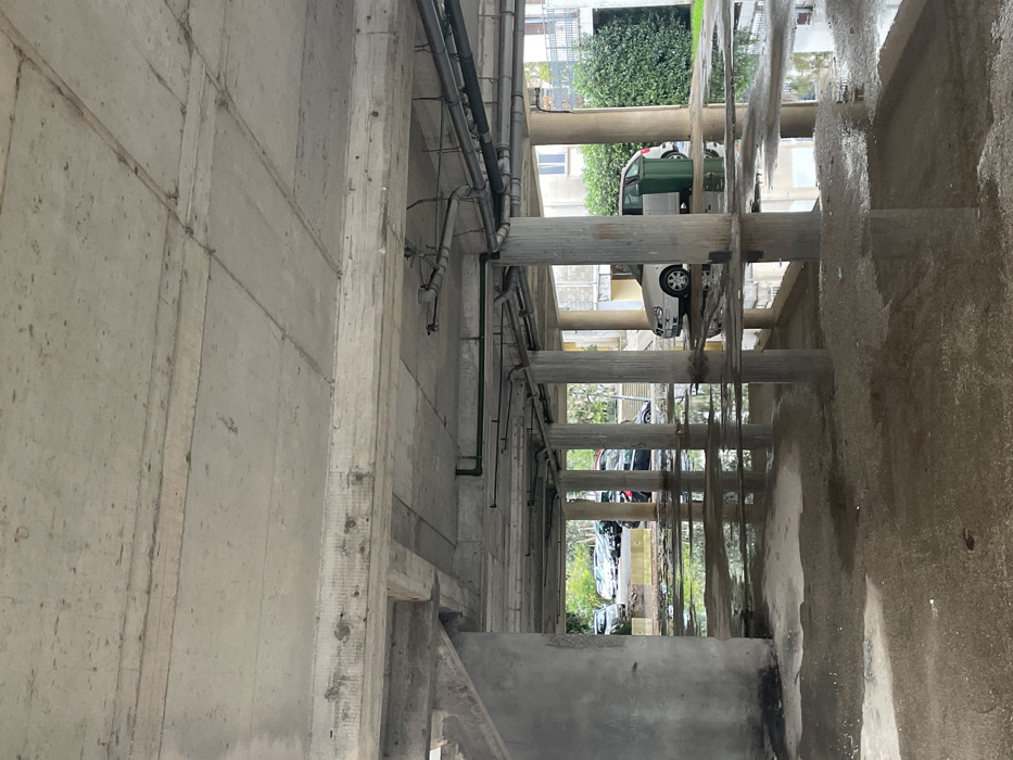An outdoor view looking out between two cement walls and structural supports. The view is upside down, depicting cars parked on a street, green bushes, and apartment buildings. Water droplets hang from the supports. Pipes run along the left wall. The right wall is rough and textured.