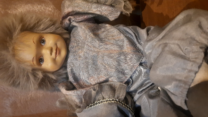 A porcelain doll lies on its side, featuring a hand-painted face with freckles and blue eyes. The doll has fluffy, light-colored hair. It wears a silver-blue outfit with shiny, textured fabric. The sleeves are adorned with ruffled trim. The doll's expression is a slight smile. The background is out of focus.