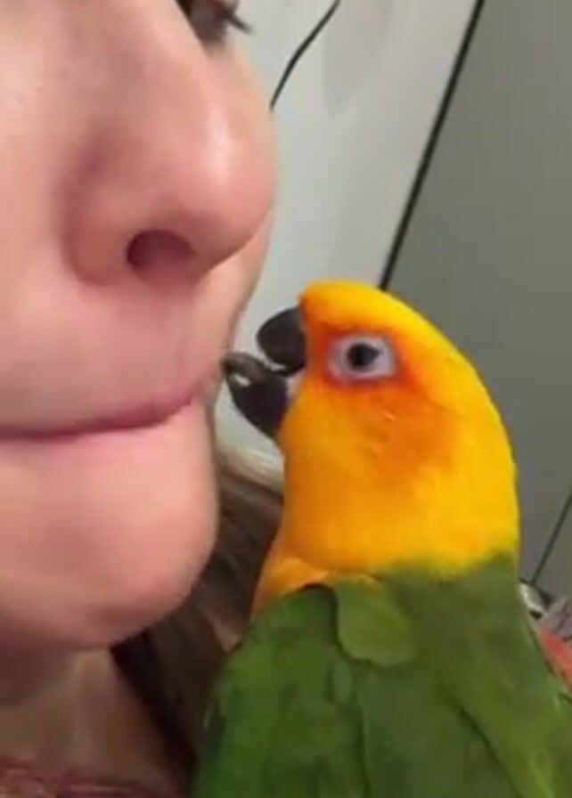 close-up shot of a fair-skinned woman's face as a parrot pecks at her lips