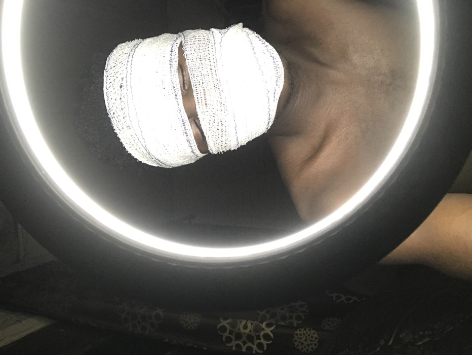 A person's head is wrapped in white bandages, obscuring their face except for a sliver of skin. The head and shoulders are framed by a circular light source, possibly a ring light. The background is dark, and the subject is positioned at an angle, with the top of their head near the top left of the frame. A pattern is visible in the lower portion of the frame. The overall impression is one of injury or medical treatment.