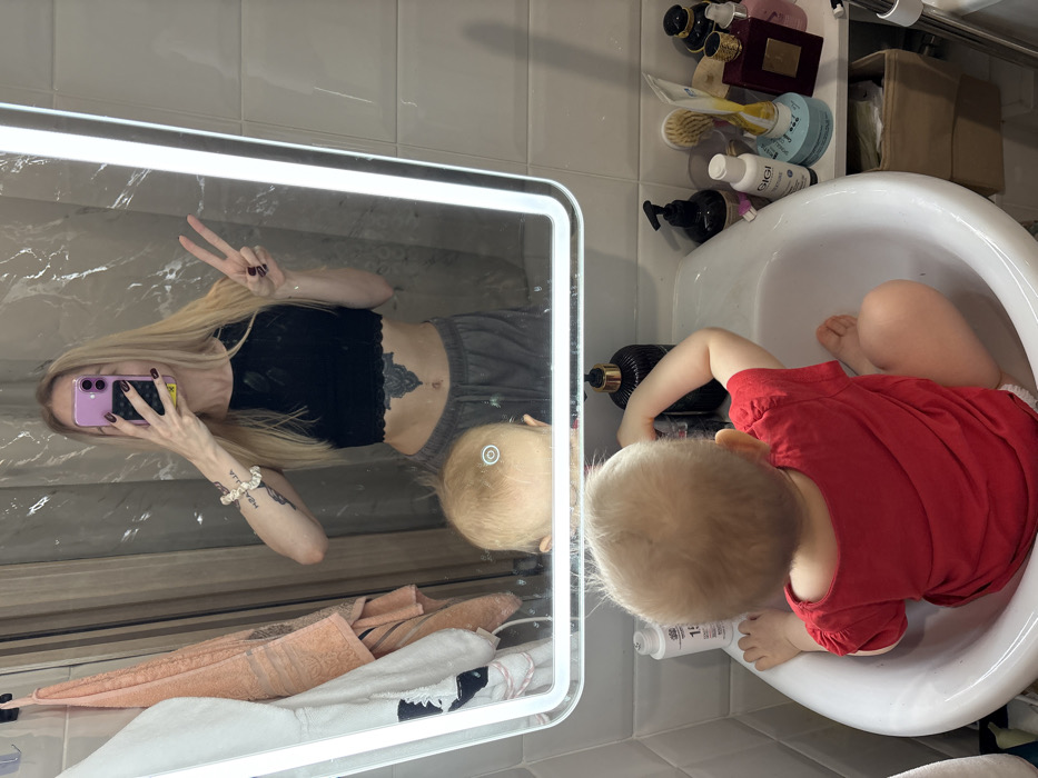A woman takes a selfie in a bathroom mirror. She wears a black top, grey shorts, and has blonde hair. She holds up two fingers. Beside the mirror, a baby in a red shirt is in a white sink. The sink area has various toiletries and personal care items. There are towels under the mirror.
