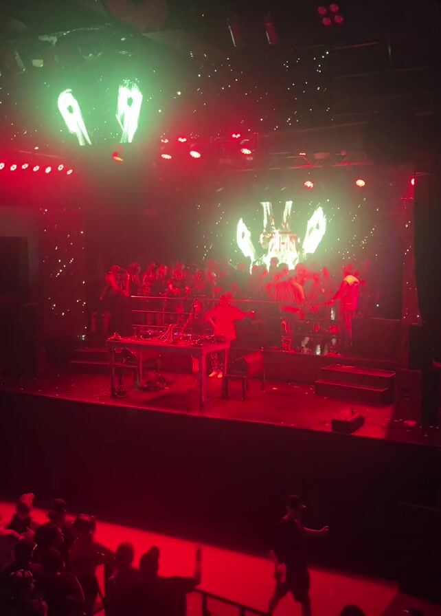 DJ performing on a stage in a crowded nightclub. The stage is elevated and features a DJ setup with a mixer and other equipment. The DJ is wearing a light-colored shirt and is seen gesturing and interacting with the crowd. The crowd is dancing and cheering, illuminated by red and yellow stage lighting. A large screen behind the DJ displays the artist's name in stylized letters. The club is dark, with additional lighting creating a dynamic atmosphere, and there are people moving around the dance floor.