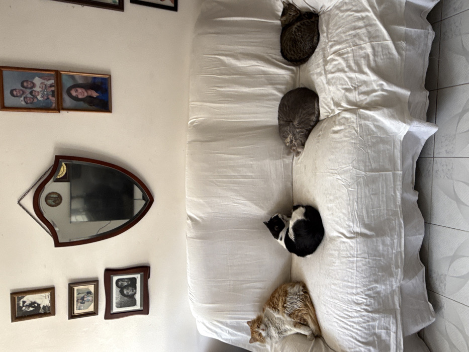 A white couch is aligned vertically with its top to the upper right and its bottom to the lower left. Four cats lie on the couch. From the top to bottom, there is a tabby cat curled into a circle, a gray cat curled into a circle, a black and white cat curled into a circle, and an orange and white cat laying flat. To the left of the couch is a white wall with framed photos and a mirror.