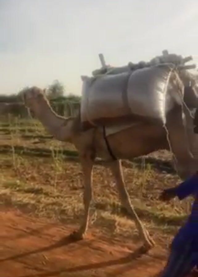 camel walking along a dirt path next to a field of tall grass. The camel is loaded with two large bags secured to its back with straps. A man wearing a blue shirt and black head covering approaches the camel from the right side of the frame and appears to touch or adjust something on the camel’s load. The sky is overcast, and some trees are visible in the background. The overall setting appears rural.
