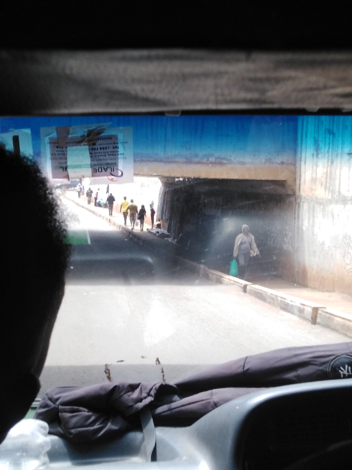 The image presents a scene from inside a vehicle, looking out through the front windshield in Kikuyu Township ward, Kenya. The foreground shows the vehicle's dark dashboard, with a crumpled black fabric item (possibly a jacket or bag) displaying a "NY" logo on the right side. The left side of the frame is occupied by the back of a person's head, indicating a driver or front passenger. Affixed to the upper center of the windshield are two transparent stickers, one prominently displaying "ILADE OIL," a Kenyan telephone number starting with "+254," and "KRA PIN." Beyond the windshield, a paved road stretches forward, passing under a concrete bridge or overpass. The underside of the bridge is shadowed and appears dark, while the sky above is bright blue. On the left side of the road, a group of approximately six to eight pedestrians, consisting of men and women in casual attire, walk away from the viewer, heading towards or through the underpass. On the right side, a solitary individual, dressed in light-colored clothing, walks on a raised concrete sidewalk, carrying a green bag in their left hand, also moving away from the viewer and approaching the shaded area beneath the underpass. The concrete supporting wall of the underpass on the right shows some discoloration and faint markings. The scene depicts pedestrian movement alongside a road infrastructure in a daylight setting.