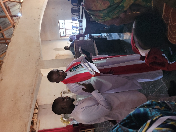 An indoor gathering is depicted in Rinze, Nigeria, within a building featuring light-colored, textured walls, a dark tiled floor, and an exposed wooden rafter ceiling. Centrally positioned, an older male, dressed in a white alb and a red stole, reads from an open book while speaking into a handheld microphone. To his left, a younger male, wearing a light-colored traditional garment, stands observing, holding a mobile phone in his right hand. In the background, several individuals are seated on white plastic chairs. A multi-paned window is visible on the right wall, and a black speaker box is situated near the foreground figures. A small white structure with golden embellishments is partially visible on the far left.