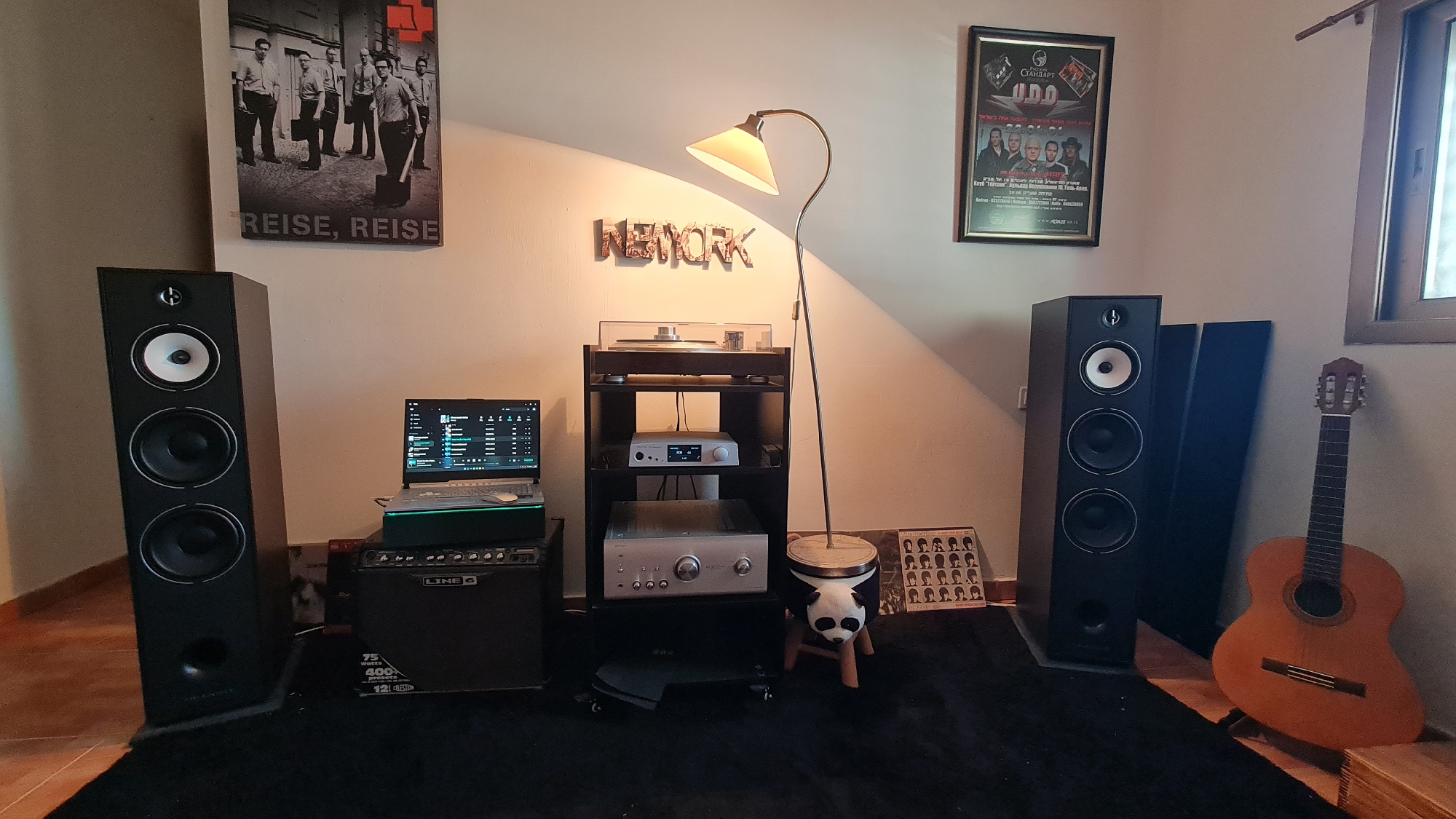 The image displays an indoor music and entertainment setup located in the Lachish Regional Council, Israel. The room has light-colored walls and a floor combining light brown tiles with a black area rug covering the central equipment arrangement. On the left wall, a black-and-white poster of the band Rammstein, featuring six men in suits with one holding a shovel, is mounted, bearing the text "REISE, REISE." Below it, a black floor-standing loudspeaker with a tweeter and two woofers is positioned on the rug. To its right, a laptop displaying a music player interface rests on an LED-illuminated stand atop a black Line 6 guitar amplifier. The center of the wall features a textured "NEW YORK" sign, illuminated by a silver floor lamp with a conical cream-colored shade. Below the sign, a black multi-tiered audio rack holds a turntable with a transparent dust cover on its top shelf, a silver audio component (possibly a streamer/DAC) with a digital display showing "PCM 44.1" on the middle shelf, and a larger silver amplifier on the bottom shelf. A small, low stool with a panda head design is placed on the rug next to the floor lamp. On the right wall, a framed poster with Hebrew text, a yin-yang symbol, and images of several men is mounted. Below it, an identical black floor-standing loudspeaker is placed on the rug. Behind this speaker, a dark panel leans against the wall. A light brown acoustic guitar leans against the wall to the right of the speaker. A vinyl record album cover featuring a grid of identical headshots, resembling The Beatles, lies on the black rug to the left of the right speaker. A window is partially visible on the far right wall. No individuals are present in the scene.