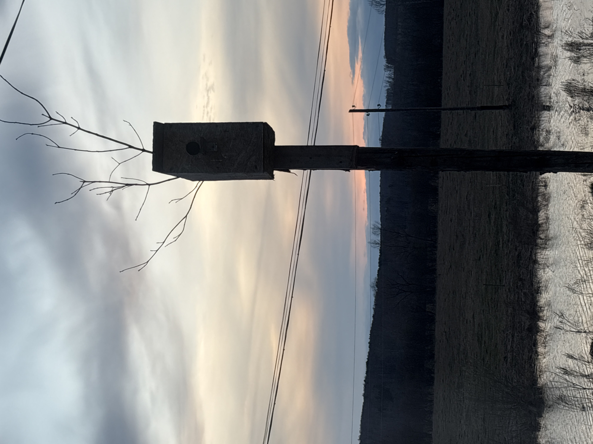 A birdhouse with a circular opening sits atop a wooden post in an outdoor setting. A thin branch protrudes from the left side of the birdhouse. In the background, power lines stretch across a landscape featuring a field, a treeline, and a sky with hues of pink and grey, likely indicative of sunrise or sunset. A fence line is visible on the right side of the scene. The location is inferred to be Bolsheustyikinskoye, Russia.