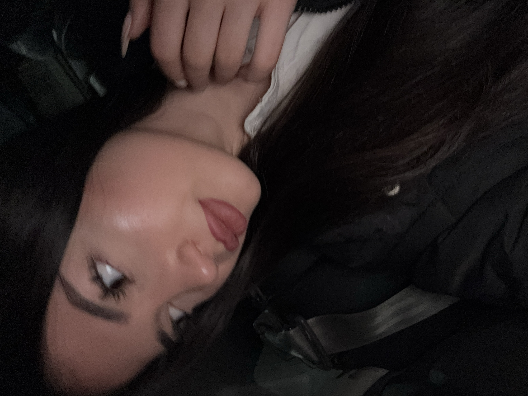 An overhead, angled photograph depicts a young adult female seated inside a vehicle. Her upper torso, head, and right hand are visible. She has long, dark hair and is wearing a dark outer garment over a white layer, secured by a grey seatbelt strap visible across her left shoulder and chest. Her face, featuring defined eyebrows and red-toned lipstick, is turned to her right, with her gaze directed further right and slightly upwards, not engaging the camera. Her right hand, exhibiting elongated, light-colored fingernails, is positioned near her neck and chin area. The background is dark and indistinct, consistent with a vehicle interior at night or in low light. No discernible features within the image indicate a specific location in the city of Plovdiv, Bulgaria.