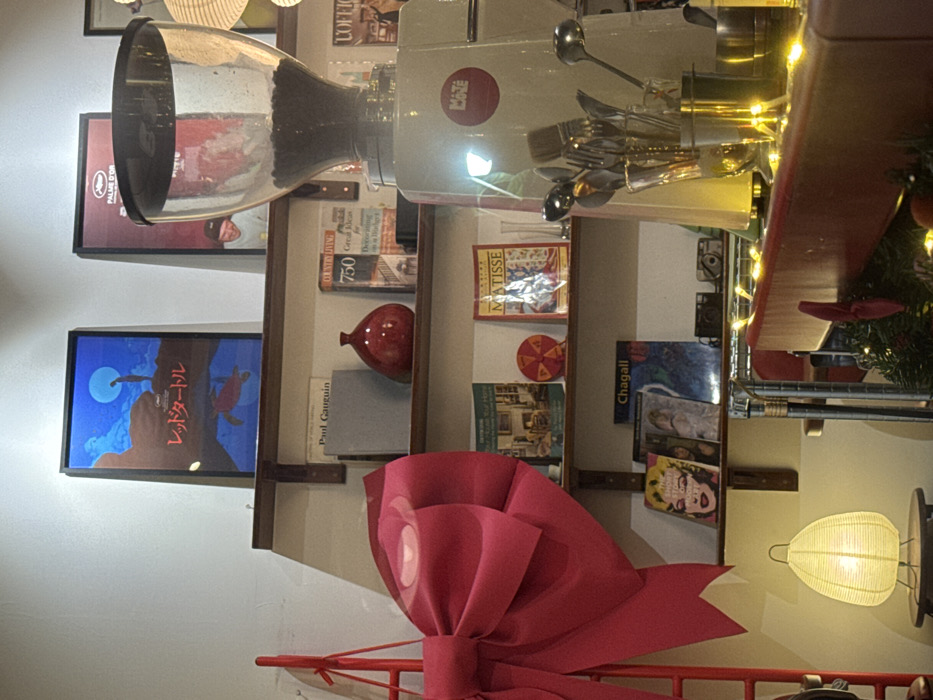 This image displays an interior space, likely a cafe or retail establishment. The specific location within Thủ Đức, Vietnam, cannot be determined from the visual evidence. The scene features a white wall with three visible wooden shelves. The top shelf displays a framed poster for "The Red Turtle" animated film, depicting a figure on a cliff under a large blue moon with a red turtle below. Adjacent to it on the right is a partially visible framed poster with "Palmes d'Or" text, reflecting a person wearing a light blue shirt. The middle shelf holds books, including one titled "Paul Gauguin," a glossy red ceramic vase, and a book titled "COUNTRY LIVING 750 Great Ideas for Decorating & on a Budget!". The bottom shelf contains more books, one labeled "MATISSE" and another "Chagall," a circular multi-colored decorative object, a small clear glass vase, and two vintage cameras. On the left, a large, bright magenta fabric bow is affixed to a red vertical structure. Below it, a glowing paper lantern-style table lamp sits on a small round table. On the right, a white "MATE" brand coffee grinder, featuring a transparent hopper filled with coffee beans, is visible. In front of the grinder, on a reddish-brown counter decorated with warm string lights, various kitchen utensils (spoons, forks, ladles, brushes) are arranged in containers. A small section of green decorative foliage is also present on the counter. No individuals are actively present or performing actions within the immediate foreground.