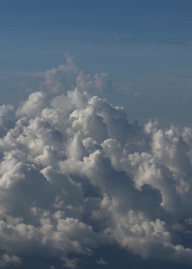view from above a thick layer of white and gray clouds, set against a backdrop of a blue sky