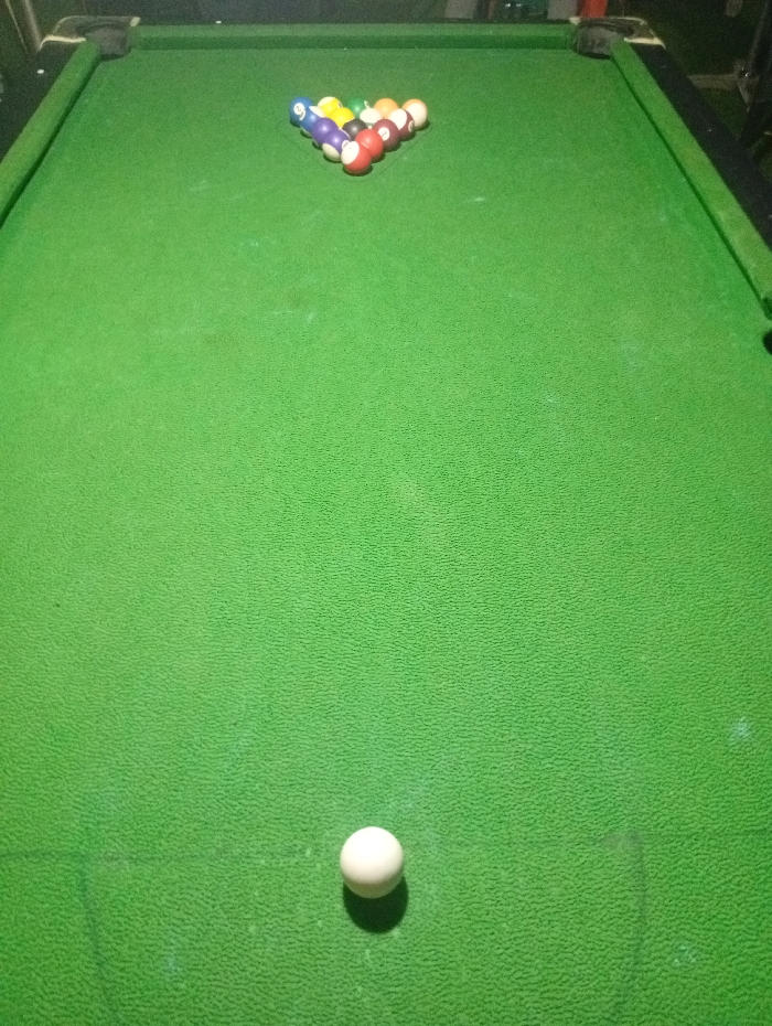 A pool table dominates the scene. It's covered in green felt with visible texture. A rack of fifteen pool balls arranged in a triangle sits at the far end. At the opposite end, a single white cue ball rests on the green surface. The table's wooden rails and corner pockets are visible along the edges. The lighting is somewhat dim.