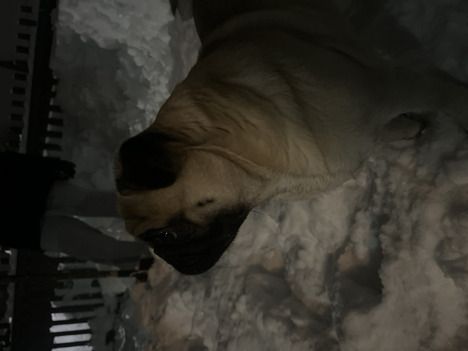 The image depicts a nighttime scene outdoors in Vasilyevo, Russia, characterized by significant snow cover. In the foreground, a fawn-colored pug dog stands facing slightly left of the viewer, with its head turned to the left and looking upwards. The dog has a prominent black mask, dark ears, and visible wrinkles on its neck. Its left eye is visible, reflecting some light. The ground beneath the dog is covered in uneven, white snow. In the background, partially obscured by darkness, a person is visible from the mid-torso down, wearing light-colored trousers and a dark upper garment, standing in the snow. Behind the person and further back, a dark-colored fence with vertical slats is present, with snow piled against it. The scene is illuminated by an unseen artificial light source, casting shadows and highlighting textures in the snow.