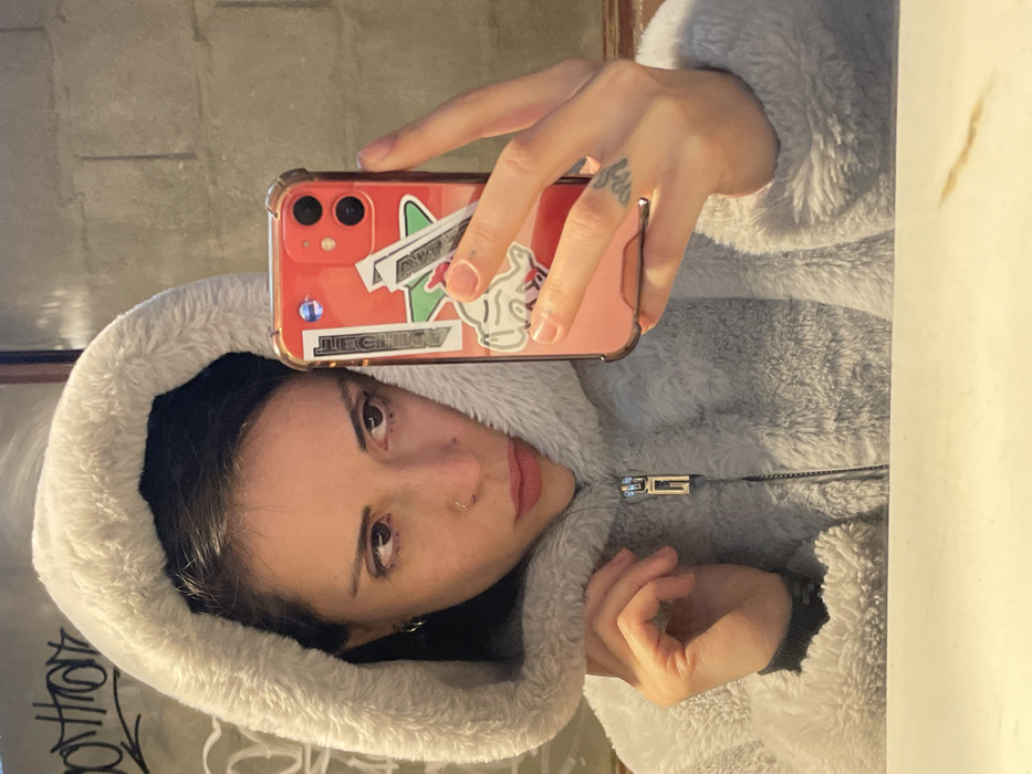 A woman in a gray hooded jacket holds an orange phone with stickers. She looks at the camera with a slight tilt of her head. Her dark hair is visible under the hood. Part of a mirror reflects behind her, showing a cinder block wall and some writing. The phone is positioned in front of her face, with her hand holding it steady.