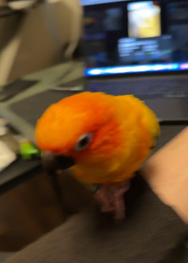 A sun conure perches on a person's left forearm, close to the wrist. The bird's plumage displays bright yellow, orange, and red hues. A computer monitor in the background displays coding. A laptop, a second monitor, and a keyboard are also visible on the desk. The overall setting is a workspace or office environment.