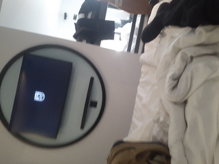 An interior room, likely a hotel or dormitory, is depicted in Saint-Denis, France. A bed covered in rumpled white bedding occupies the foreground. On the lower left, a partial view of a light-colored backpack rests on the bed. On the lower right, a person's legs and feet, clad in black clothing, are positioned on the bed. A wall-mounted flat-screen television, displaying a white Philips logo on its dark screen, is centrally positioned within a large circular black frame on the wall. Below the television, a black horizontal shelf-like fixture with a smaller rectangular component is mounted. To the right, a vertical mirror reflects an adjacent area of the room, revealing a bed structure, the upper torso of a person in black clothing, and an overhead light fixture, indicating a brightly lit environment.