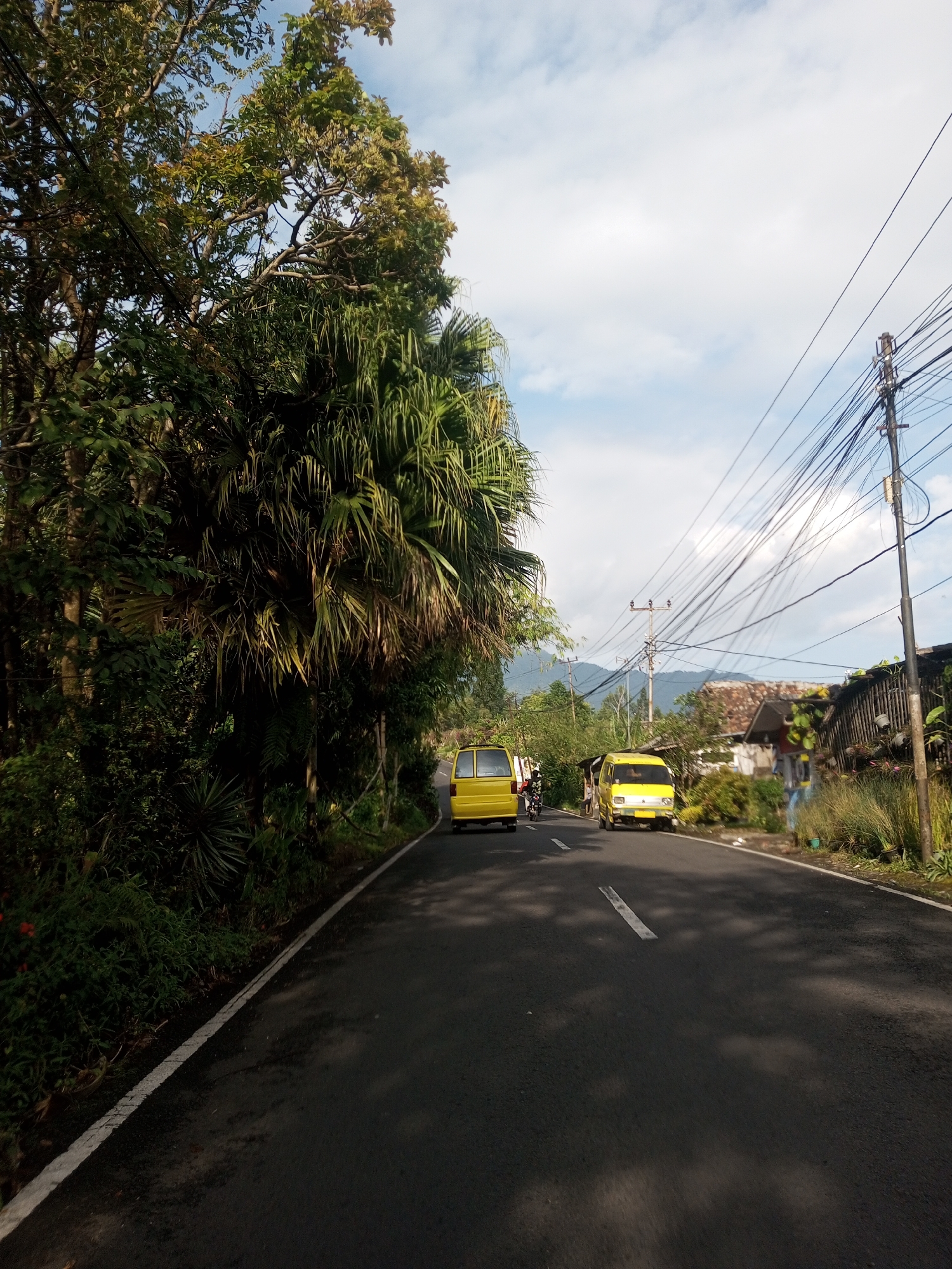 The image depicts a road in Mya Sit Kaing Ywar Thit, Myanmar. The asphalt road has a white line marking the edge on the left and a broken white line down the center. Two yellow vans are driving on the road. A motorcycle is positioned between them. Lush green trees and foliage line the left side of the road. On the right side of the road are houses and more vegetation. Overhead power lines crisscross the sky. Mountains are visible in the background beneath a partly cloudy sky.