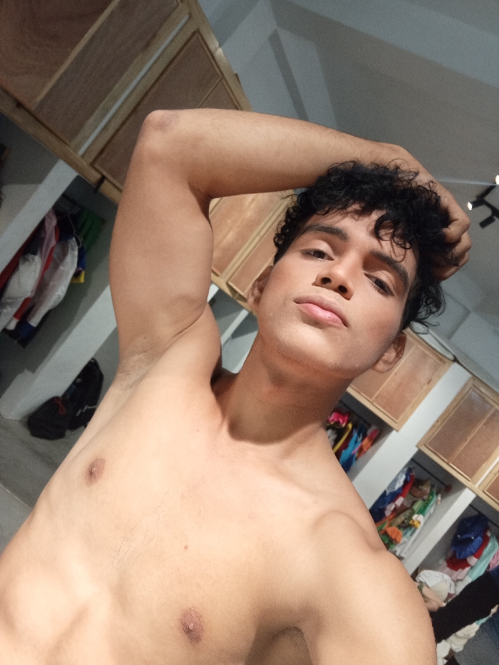 A young man with curly hair poses shirtless for a selfie. He holds one hand on his head, arm raised, revealing his armpit. Wardrobes filled with clothes are behind him. The man has fair skin and full lips. Lighting is overhead, casting shadows on his physique and the wardrobes. He appears relaxed and confident.