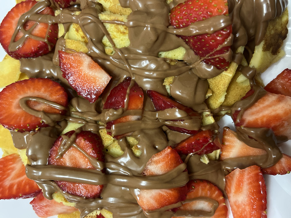 The image displays a close-up, top-down view of a dessert dish. The main components consist of numerous irregularly shaped pieces of light yellow, cooked dough, resembling small waffles or pancakes, which form the base. These pieces are generously covered with a viscous, light brown substance, identified as melted chocolate or a chocolate spread, drizzled in an uneven pattern. Scattered across and partially embedded within the chocolate and dough are multiple fresh strawberry halves and slices. These strawberries exhibit bright red exteriors with visible seeds and lighter red to white interiors where cut. The dessert rests on an indistinct white surface, likely a plate, which is largely obscured by the food. No individuals, specific actions, or other environmental details are visible within the frame. This scene is situated in Burgas, Bulgaria.